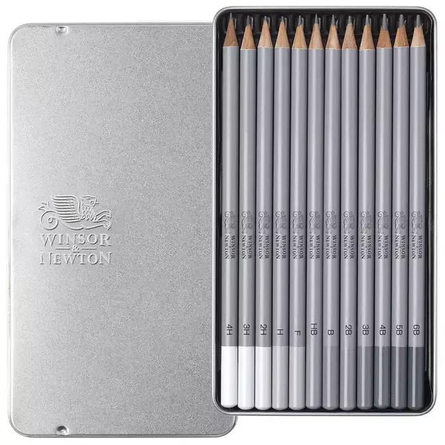 Una gama de lápices de grafito para bocetar y dibujar, adecuados para difuminados, sombreados suaves y detalles finos. Ideales para capturar movimiento o inspiración en cualquier momento, vienen en diferentes niveles de dureza: los grados H son los más adecuados para dibujos delicados e intrincados, mientras que los grados B, más suaves y oscuros, son ideales para sombrear y cubrir suavemente áreas amplias. Para un toque final perfecto, se presentan en elegantes estuches metálicos lisos, grabados con el icónico logo de Winsor & Newton.
